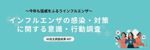 今回の調査から、インフルエンザの感染は大人よりも子どもに多く見られ、学校や保育園で感染した子どもから家庭内に広がるという実態が明らかになりました。普段行っている対策は手洗い・うがいやマスク着用といった基本的なものが多いですが、50~60代の女性や受験生がいる家庭では、免疫力向上食品への関心や、より積極的な対策への意欲が見られます。