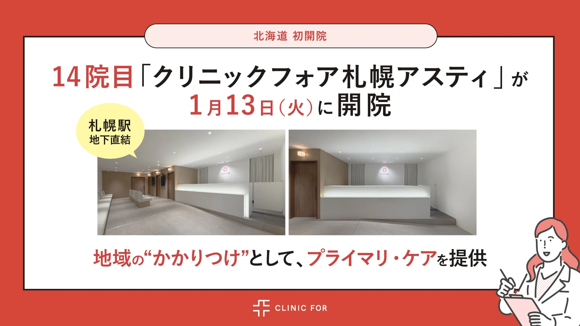 【北海道 初開院!札幌駅地下街直結】14院目「クリニックフォア札幌アスティ」1月13日(火)に開院