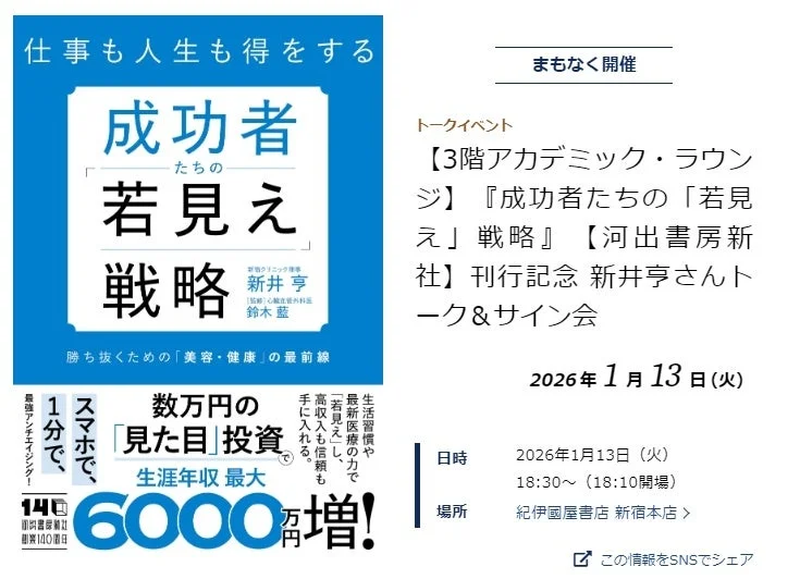 新井亨氏、『成功者たちの若見え戦略』出版記念イベントを紀伊國屋書店新宿本店で開催